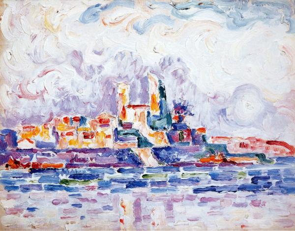 Le tableau représente la vue d'Antibes, une ville de la Côte d'Azur, au coucher du soleil, avec des couleurs chaudes dominant la composition.