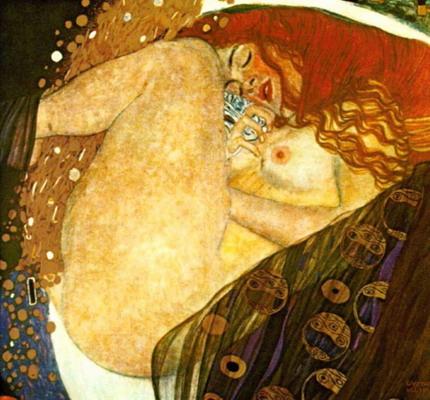 "Après l'étreinte du Baiser, Klimt peint l'extase amoureuse, pièces d'or et spermatozoïdes dorés roulent entre les cuisses de la belle endormie.."