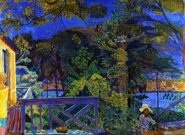 "Ce tableau de grand format est le plus vaste des trois "grandes terrasses" de P Bonnard. Son défi est de restituer les éléments d'une scène, deux femmes dont l'une nous tourne le dos et l'autre s'avance vers nous, tout en accordant au paysage la place essentielle.