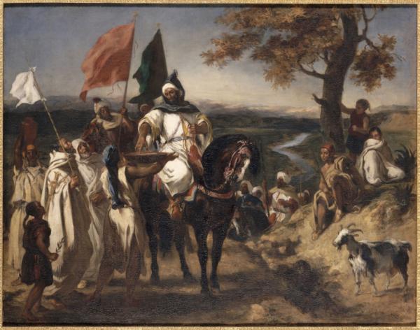 Le peintre trouvera une nouvelle source d'inspiration à l'occasion d'un voyage au Maroc, en 1832. Il y restera 6 mois au cours desquels il remplira ses carnets de croquis, dessins et aquarelles. A ces voyages, on doit'la mariée juive de Tanger'la 'Fantasia arabe', 'le Sultan du Maroc','Rencontre de cavaliers maures' et' Les Femmes d'Alger dans leur appartement'.Toiles refusées par le jury du Salon en 1834 ou blamées par les critiques comme 'Les Femmes d'Alger'.
